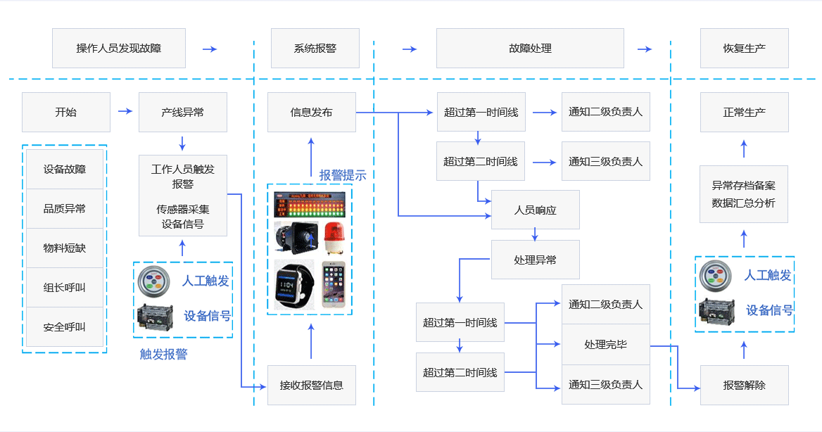 安燈系統(tǒng)管理生產(chǎn)的整個(gè)過(guò)程,自動(dòng)糾正生產(chǎn)過(guò)程中的錯(cuò)誤,通過(guò)實(shí)時(shí)監(jiān)控生產(chǎn)過(guò)程中的所有緊急事件并提供決策支持,以達(dá)到生產(chǎn)調(diào)度的要求;在生產(chǎn)計(jì)劃出現(xiàn)異常或偏差時(shí),及時(shí)向有關(guān)人員反饋,進(jìn)而采取適當(dāng)措施,最終實(shí)現(xiàn)資源平衡和優(yōu)化配置,實(shí)現(xiàn)制造時(shí)間和成本的優(yōu)化,實(shí)現(xiàn)整體優(yōu)化的目標(biāo)。