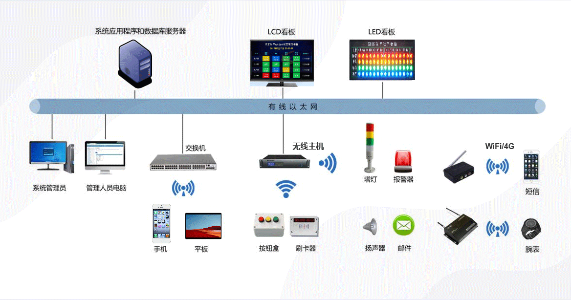 生產(chǎn)現(xiàn)場(chǎng)看板和對(duì)應(yīng)工作指示燈報(bào)警,看板輸出外接揚(yáng)聲器語(yǔ)音播報(bào)。